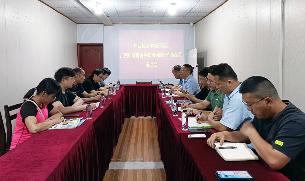 在座談會上,肖志科總經(jīng)理對婁兵海所長一行到訪表示歡迎,并介紹了科虹公司的基本情況。公司經(jīng)過多年的努力與發(fā)展,積累了豐富的病蟲害防治經(jīng)驗,農(nóng)、林病蟲害專業(yè)化統(tǒng)防統(tǒng)治服務(wù)能力,并取得了顯著的經(jīng)濟效益、社會效益和生態(tài)效益。他指出,廣西特色作物研究院歷史悠久,人才濟濟,科研碩果累累,此次到訪公司感到非常的高興。希望研究院專家多到公司指導(dǎo),雙方在統(tǒng)防統(tǒng)治、技術(shù)交流、產(chǎn)品開發(fā)等領(lǐng)域開展交流合作,為有害生物防治和我區(qū)的農(nóng)業(yè)現(xiàn)代化和生態(tài)文明建設(shè)事業(yè)做出更大的貢獻。