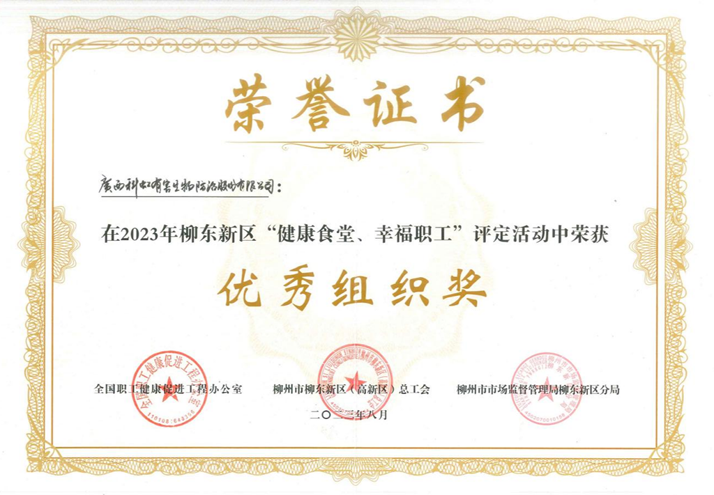 近日,全國職工健康促進工程辦公室聯合柳州市柳東新區(qū)(高新區(qū))總工會、柳州市市場監(jiān)督管理局柳東分局于2023年6月至8月在新區(qū)范圍內開展“中國夢·勞動美——凝心鑄魂跟黨走 團結奮斗新征程”為主題的柳東新區(qū)“健康食堂、幸福職工”評定活動圓滿落幕,科虹公司被評為2023年柳東新區(qū)“健康食堂,幸福職工”優(yōu)秀組織!