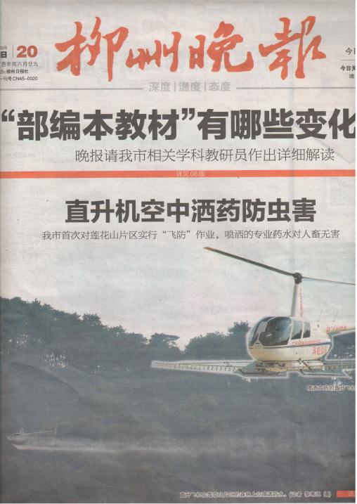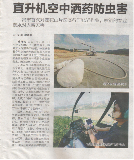 2017年8月16日-18日廣西科虹有害生物防治有限公司對三門江森林公園林區(qū)及周邊林區(qū)開展飛防作業(yè),共飛行67架次,對4萬畝林地噴灑了防治藥液。這是柳州市首次使用直升機(jī)對蓮花山片區(qū)進(jìn)行蟲害防治,此次作業(yè)主要防治松墨天牛,進(jìn)而防治該林區(qū)的松材線蟲病。柳州晚報對此次飛機(jī)防治作業(yè)進(jìn)行了報道。具體報道見圖1和圖2。