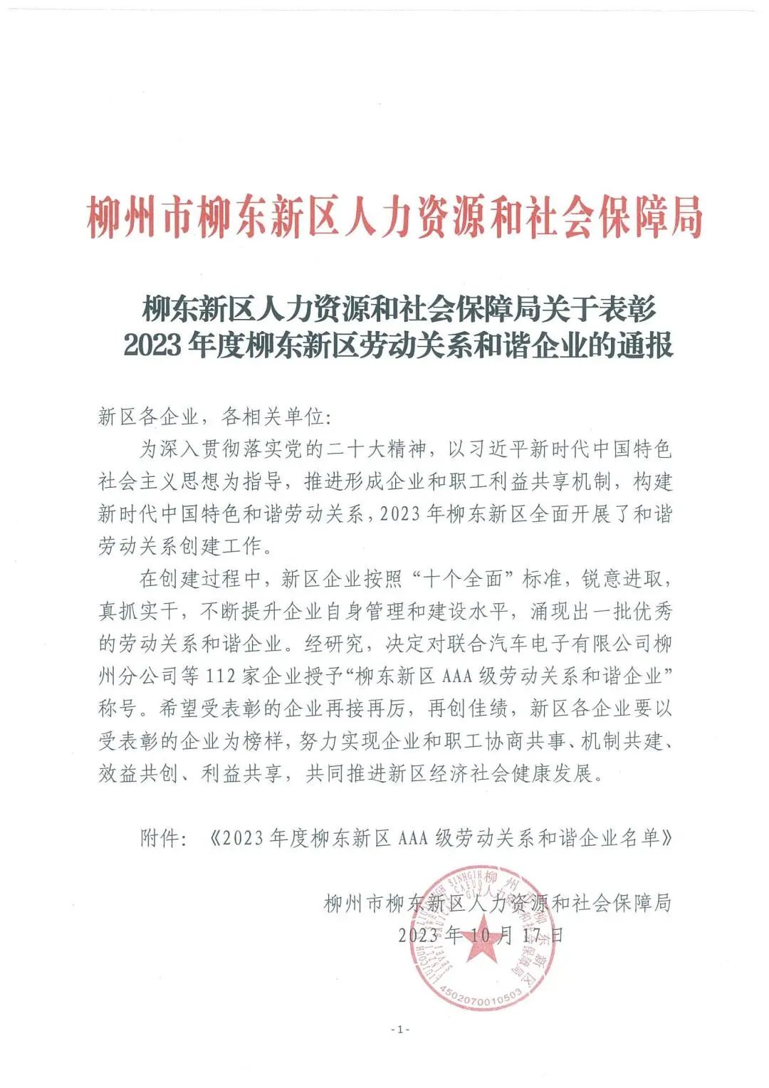 10月17日,柳州市柳東新區(qū)人力資源和社會(huì)保障局發(fā)文公布2023年度柳東新區(qū)勞動(dòng)關(guān)系和諧企業(yè)名單,科虹公司被認(rèn)定為“柳東新區(qū)AAA級(jí)勞動(dòng)關(guān)系和諧企業(yè)”。