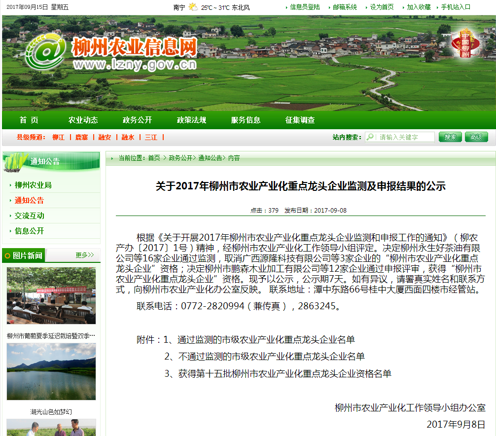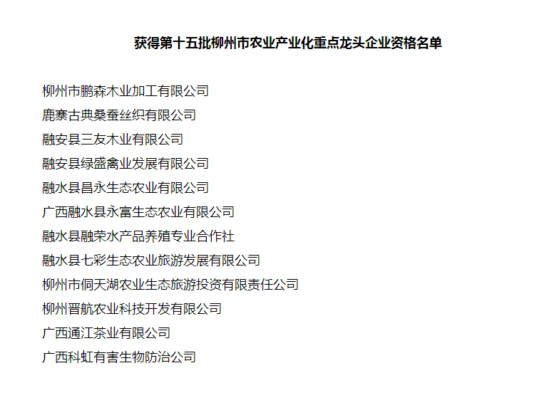 圖2 獲得第十五批柳州市農(nóng)業(yè)產(chǎn)業(yè)化重點(diǎn)龍頭企業(yè)資格名單