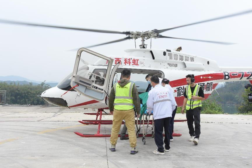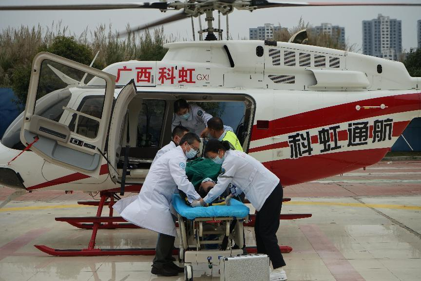 此次演練模擬了廣州市婦女兒童醫(yī)療中心柳州醫(yī)院接到120指令,派救護(hù)車(chē)接急需治療的患者。但因患者傷情緊急,急需救治,通過(guò)直升機(jī)轉(zhuǎn)運(yùn)至醫(yī)院救治的航空醫(yī)療救援病患轉(zhuǎn)運(yùn)過(guò)程。