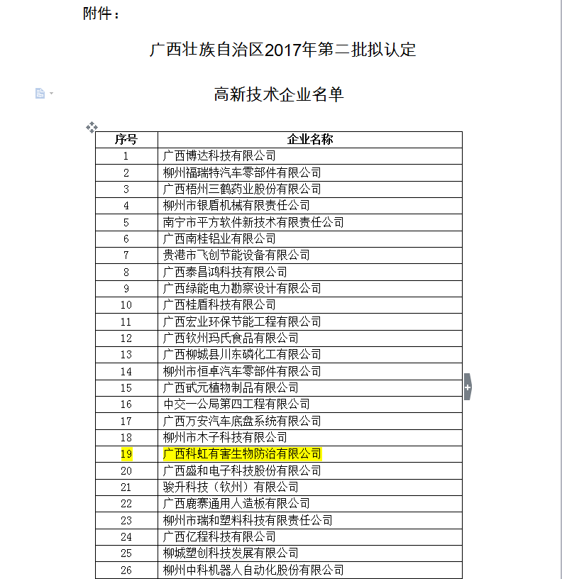 2017年10月23日,全國高新技術(shù)企業(yè)認(rèn)定管理工作領(lǐng)導(dǎo)小組辦公室在高新技術(shù)企業(yè)認(rèn)定管理工作網(wǎng)發(fā)布“于公示廣西壯族自治區(qū)2017年第二批擬認(rèn)定高新技術(shù)企業(yè)名單的通知”。通知中根據(jù)有關(guān)規(guī)定,將廣西壯族自治區(qū)2017年第二批156家企業(yè)擬認(rèn)定高新技術(shù)企業(yè)名單予以公示。公示名單中,廣西科虹有害生物防治有限公司獲得高新技術(shù)企業(yè)認(rèn)定。