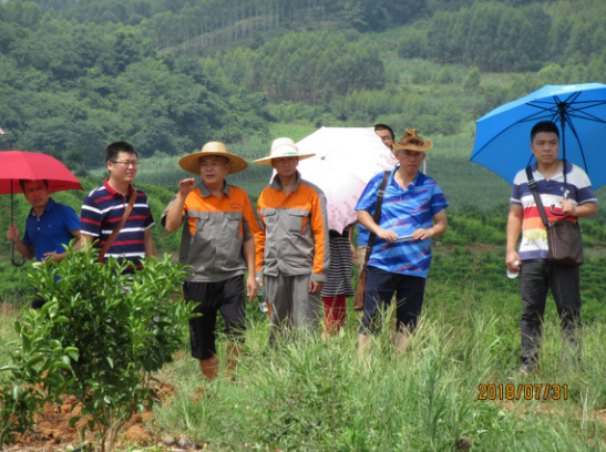(圖一 科虹公司農(nóng)林工程部經(jīng)理韋軍<左三>為現(xiàn)場觀摩人員介紹項目飛防服務(wù)情況)