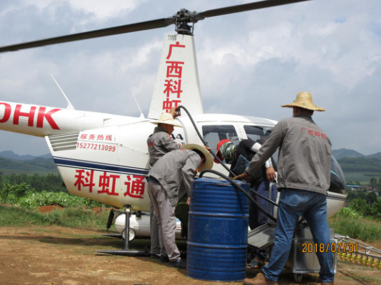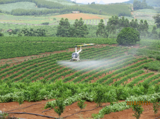 (圖三 科虹公司直升機正在實施柑橘木虱飛防服務(wù))