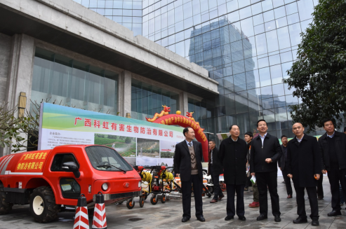 圖二:國務院參事、農業(yè)農村部原副部長劉堅<左二>、柳州市副市長朱富庭<左三>、柳州市農業(yè)局局長溫承全<左四>等領導在科虹公司展區(qū)參觀指導(有人駕駛直升機)