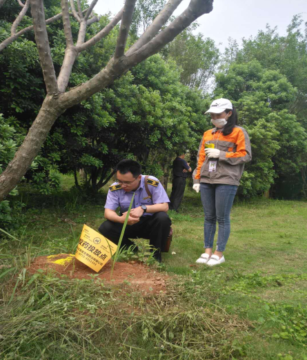 圖二 科虹員工韋文君陪同農(nóng)業(yè)部全國農(nóng)業(yè)技術(shù)服務(wù)中心王曉亮處長檢查投藥后紅火蟻取食毒餌情況