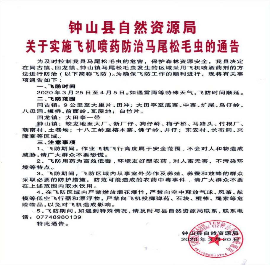 此次鐘山縣越冬代松毛蟲飛防的地點為鐘山、同古、回龍、公安等四個鎮(zhèn)的馬尾松毛蟲發(fā)生的重點區(qū)域,防治面積約1772公頃。