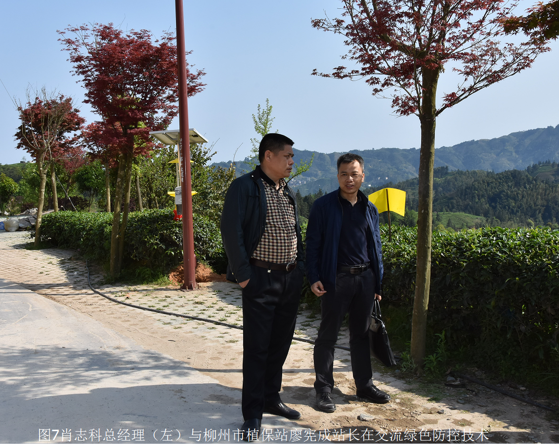 圖7 肖志科總經(jīng)理(左)與柳州市植保站廖憲成站長在交流綠色防控技術(shù)